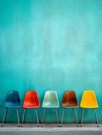 An eclectic row of retro plastic chairs in bold shades, set against a lively turquoise textured backdrop, evoking mid-century charm on a rugged concrete surface.