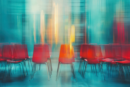 Explore this abstract portrayal of a modern office meeting room captured in motion, showcasing vibrant colors and chaotic energy, perfect for conveying dynamic professional environments.