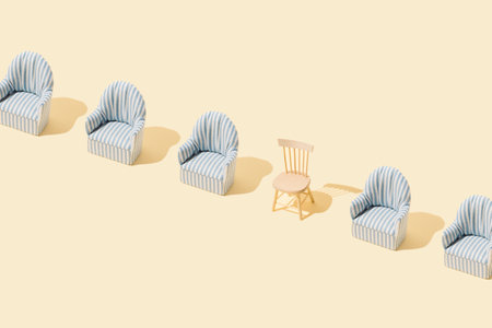Wooden chair arranged with armchairs. Minimal lifestyle concept. Pattern.