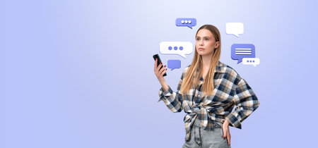A woman holding a smartphone with multiple speech bubbles around her on a light blue background. Concept of communication, chat, and social media interaction
