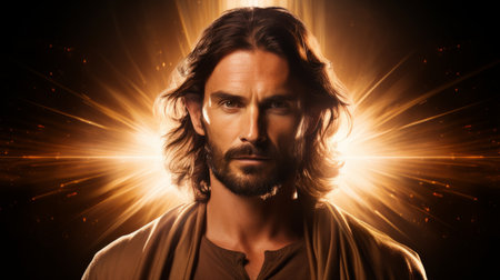 Jesus Christ surrounded by a halo of divine light, embodying sacrifice and resurrection. Bible icon. Concept of salvation, Easter, sacred moments, crucifixion, rebirth, faith, and divine love. Art