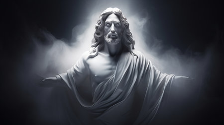 Statue of Jesus Christ on gray background with copy space for text.