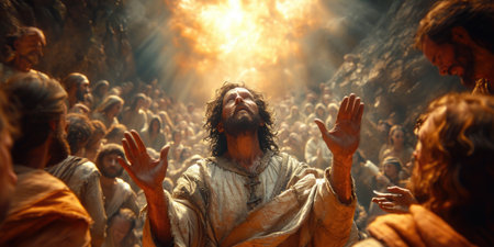 Ascendant Jesus among followers, divine glory. In a powerful scene, Jesus ascends surrounded by followers, divine glory shining upon them all