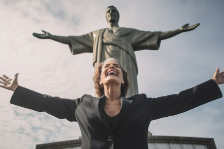 Happy businesswoman with arms outstretched standing in front of a statue