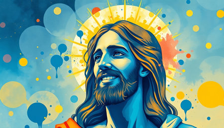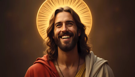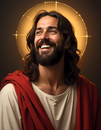 A warm and joyful figure with long hair exudes love and kindness. Surrounded by a radiant halo, his smile lights up the space, symbolizing hope and divine grace.