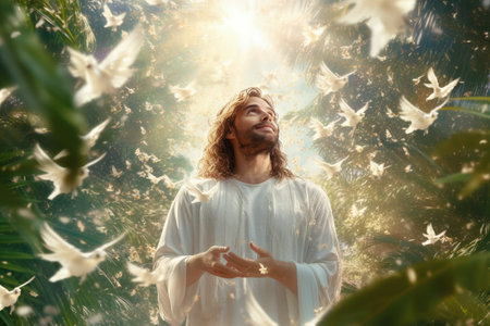 In a moment filled with divinity, a joyful figure embodies love and peace, radiating warmth and compassion, surrounded by a golden halo, inviting contemplation and inspiration.
