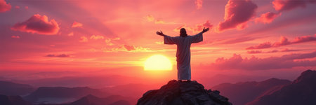 Jesus Christ on the top of a mountain at sunset. Panoramic banner