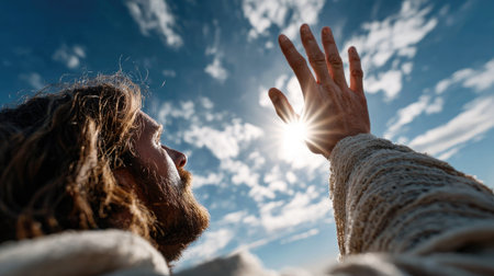 jesus is looking up in the air with a bright light behind him