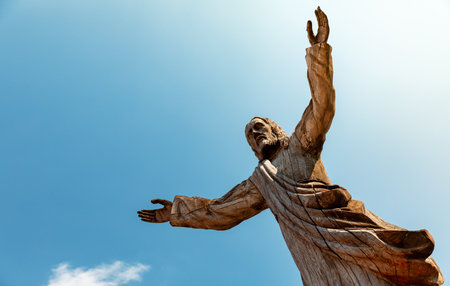 Bronze statue of Jesus looking at the sky with both arms up. On background a blue sky whit white clouds.