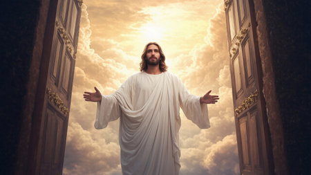 Sacred image of Jesus Christ entering the kingdom of heaven, with an open door glowing in celestial light. Symbol of Christian faith and hope.