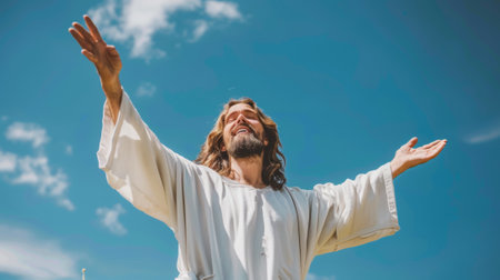 Jesus Christ facing a clouded sky with his arms outstretched. GENERATE AI