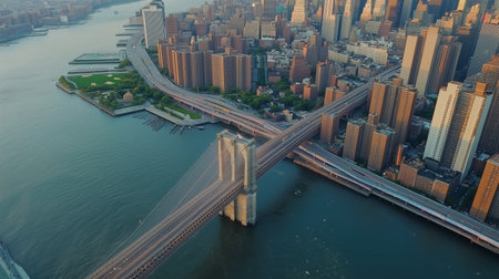 Aerial view of Brooklyn Bridge connecting Manhattan and Brooklyn with city skyline in the background during golden hour