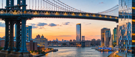 Panorama of Brooklyn Bridge and Manhattan skyline at sunset, New York City