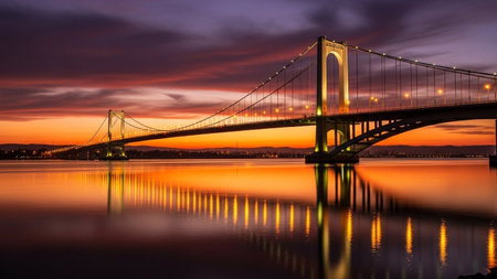 A bridge stands bold against a dramatic sunrise, where clouds and water mirror a breathtaking tapestry of crimson and violet hues.
