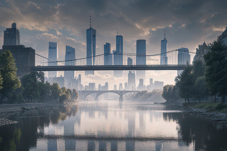 This captivating image showcases an urban landscape beneath elevated train tracks, enveloped in fog. The city skyline looms in the background, creating an atmosphere of mystery and depth.