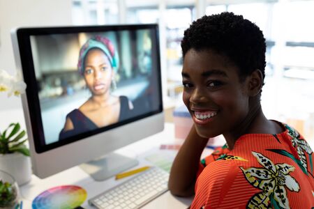 Portrait of young beautiful African american female graphic designer smiling at desk in office. This is a casual creative start-up business office for a diverse team