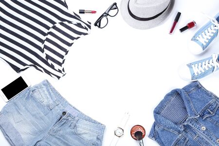 Dress Accessories women Jeans and hats sunglasses shoes on a white background.