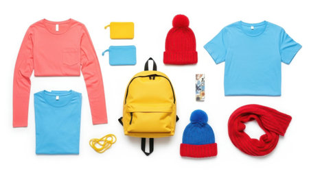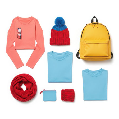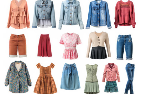 Different styles of shirts, pants, and accessories displayed on a clean white background, offering space for text or branding.
