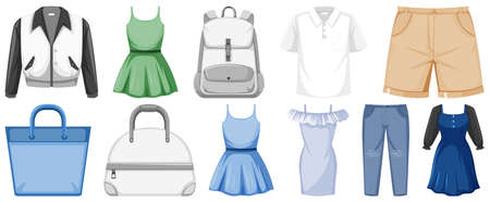 A collection of various styles of clothing, featuring shirts, pants, and accessories, neatly arranged on a white background with ample blank space.