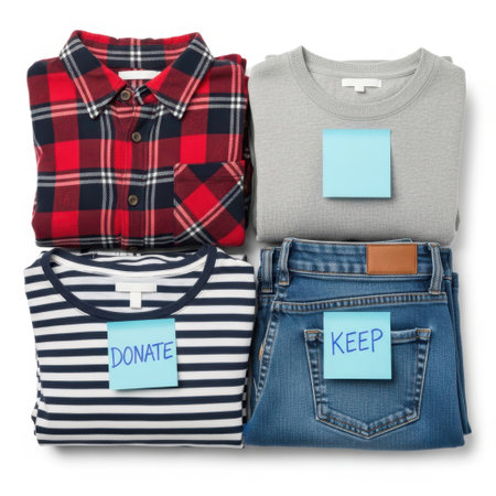 Various clothing items including shirts, pants, and accessories arranged neatly on a white background, providing a clean space for text insertion.