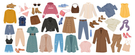 cartoon clothes. Fashion clothing, coat, jeans and dress, men and women casual garments and accessories flat vector illustration set. Modern apparel collection