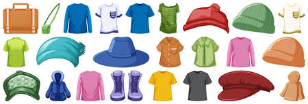 A collection of distinct styles of clothing including shirts, pants, and accessories arranged neatly against a white background, offering space for text.