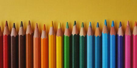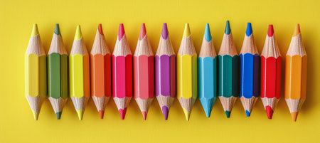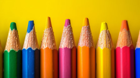 Vibrant colored pencils are lined up on a solid yellow background, showing an array of colors and sharpened tips, ideal for artistic activities or creative projects.