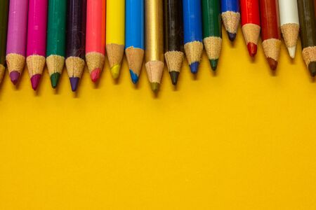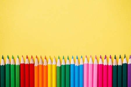 top border from colored pencils in a row on an yellow background. for design or decor. copy space