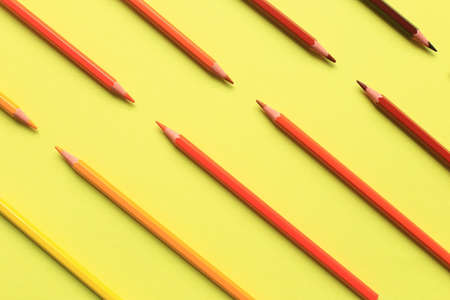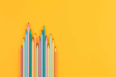 Multicolored and colorful pencils on the yellow background, stationary thing for drawing and paint