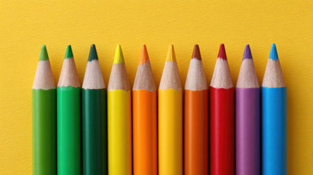 Brightly colored pencils are neatly lined up on a cheerful yellow surface, showing a variety of hues perfect for artistic projects or school activities.