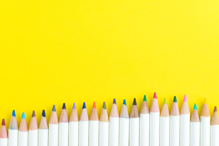 Vivid color pencils on yellow paper background with copy space using as coloring or art concept.