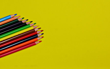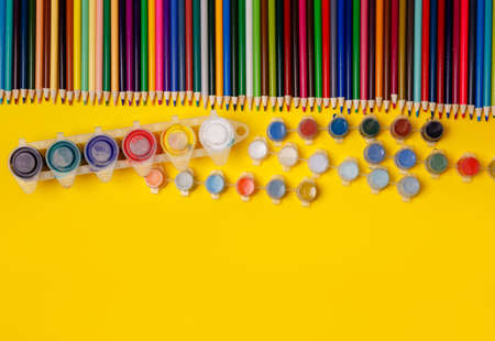 Composition with colored pencils on a bright yellow background. close-up. top view. space for text