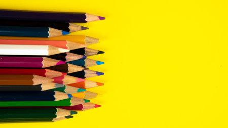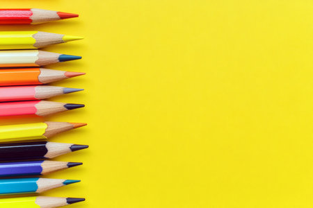 Multicolored pencils arranged in diagonal pattern on yellow background