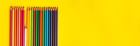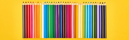 School stationery long banner with many color drawing pencils, yellow desktop background with copy space, top view