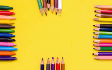 Overhead shot of stationery. Frame of school supplie on yellow paper. Color pencils. Flat lay. Space for text