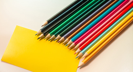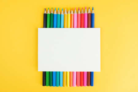 White cardboard poster on colored pencils on yellow background. Wooden pencils, lined with color spectrum. Materials for drawing and creativity.