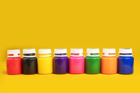 Multi-colored gouache in open jars and brushes on a yellow background. Creative leisure