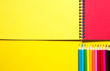 Rainbow palette of colored pencils with a spiral notebook on a yellow background, mock up, flat lay. Back to school, student recruitment, artist, drawing lessons. Copy space. Stationery for creativity