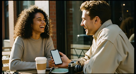 Two friends laughing and sharing a phone at an outdoor cafe table with coffee cups and a camera.
