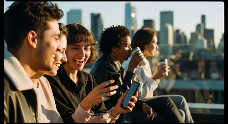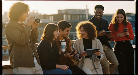 Diverse group of young people using smartphones and tablets, enjoying a sunny outdoor setting at dusk.