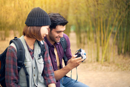 A tourist couple is resting and looking at photos on digital cameras after they took a walk in the forest. Two travelers enjoyed their vacation travel.