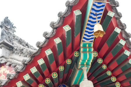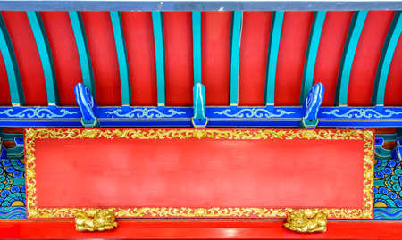 Taiwan Asian outdoor temple cultural totem carving wood yellow red white blue sky background Confucian temple