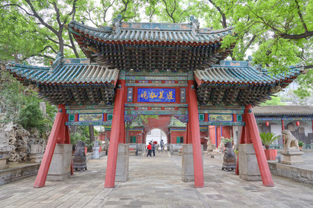 Traditional Chinese temple gate view with visitors walking through courtyard under stone archways