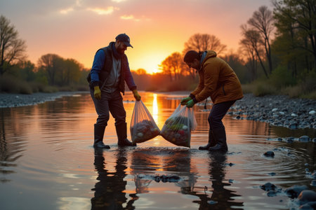 Two volunteers are passionately cleaning a polluted river in their boots, filling bags with litter and plastic floating in the water. The background features a vibrant sunset and silhouettes of trees along the riverbank.