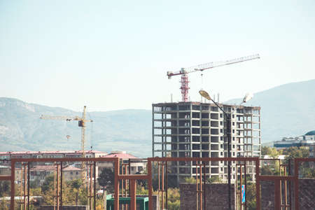 Construction of a multistory building in Budva, Montenegro. Builders are building a house. Crane working at a construction site. Sticks reinforcement of concrete.