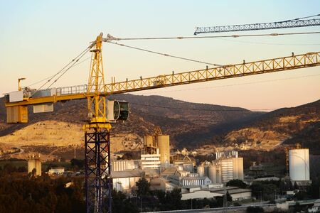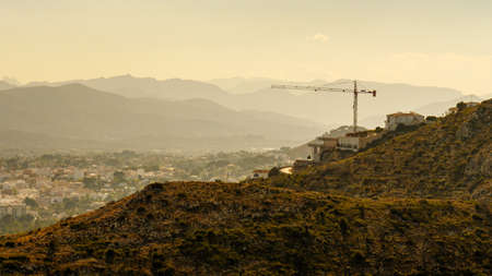 Building activity. Construction site with crane industrial equipment, spanish coast landscape