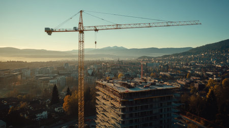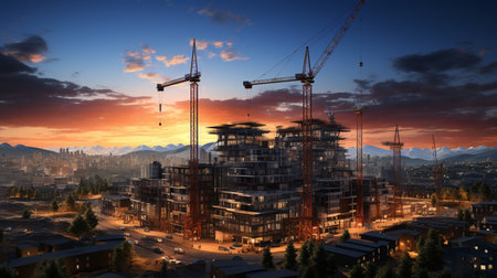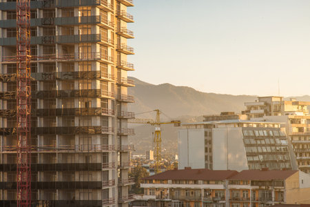 Modern residential building under construction illuminated by warm sunset light, with cranes, mountains city skyline in background, concept of urban development, architecture and infrastructure growth