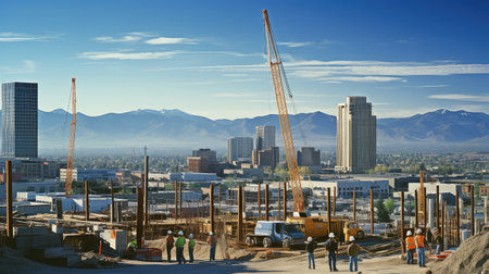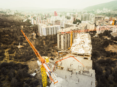 Panoramic view of workers and cranes at a large construction site in the building industry