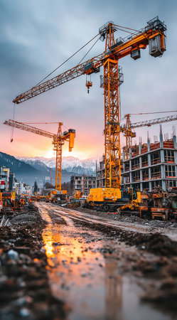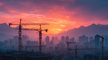 A stunning sunrise paints the sky with vibrant colors above a bustling construction site adorned with cranes. The urban skyline features towering buildings, creating a captivating scene of progress and development.