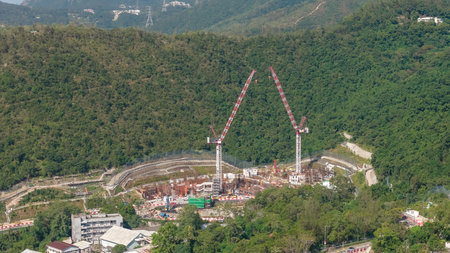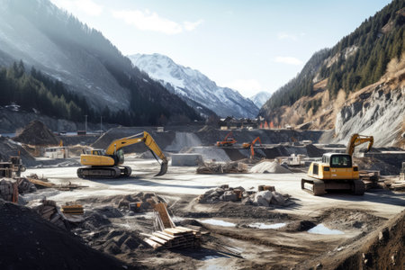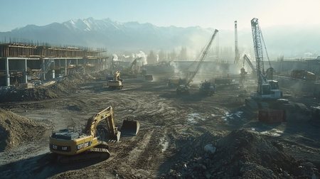 Vibrant construction site with heavy machinery and crane standing amid mountainous terrain under fog. A visual representation of urban development and engineering progress.